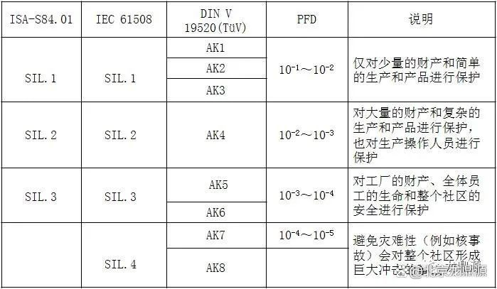 IEC 표준에 따르면, DIN V VDE0804에 따라 ISA 84.01의 SIL1-SIL4, ISA 84.01의 SIL1-SIL3 및 AK1-AI8로 나뉩니다. 그들 사이의 해당 관계는 다음과 같습니다.